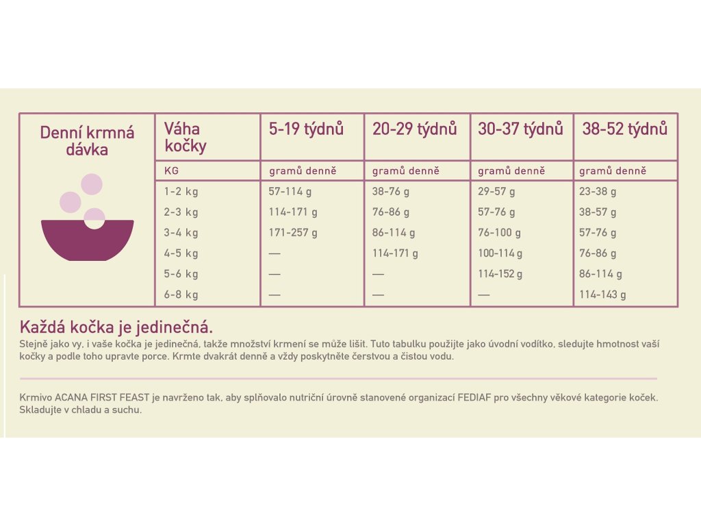 Vykročte do života svého kotěte s jídlem plným ingrediencemi z celých zvířat. ACANA FIRST FEAST je vytvořena tak, aby poskytovala vše, co vaše kotě potřebuje pro špičkový růst a vývoj. Je plné volně chovaného kuřete a celých sleďů v poměru celé kořisti (maso, orgány, chrupavky a kosti) a poskytuje tak vašemu kotěti vše co přirozeně potřebuje. Krmivo ACANA FIRST FEAST má nejlepší předpoklady k tomu, aby udrželo vaši kočku zdravou a šťastnou.