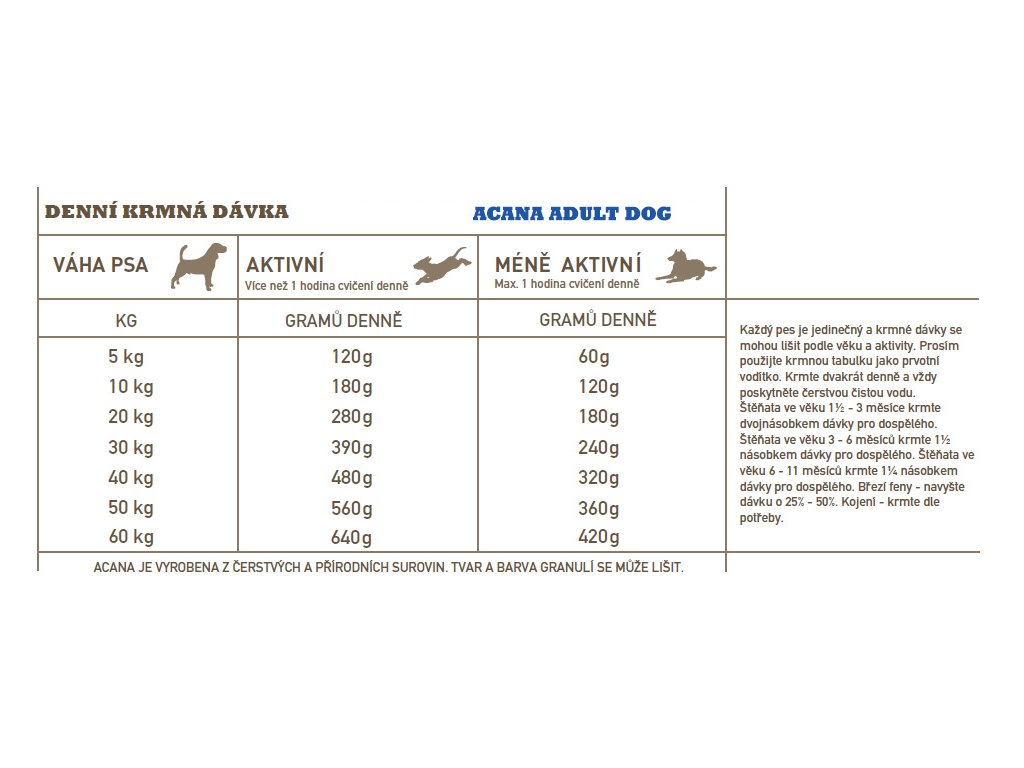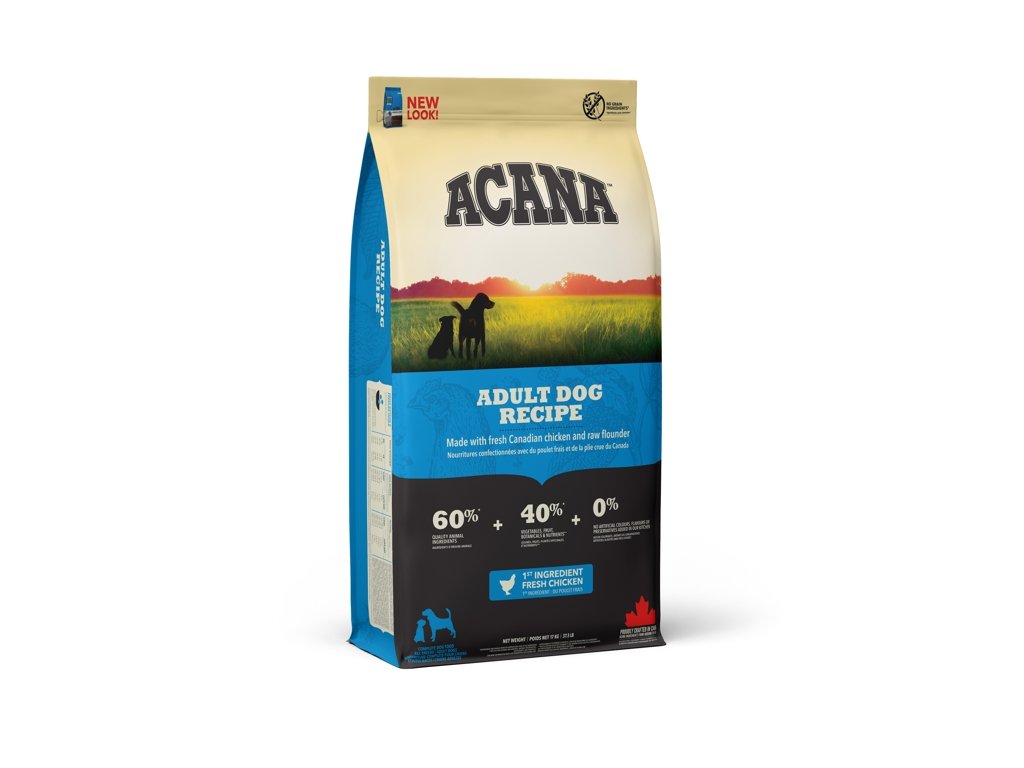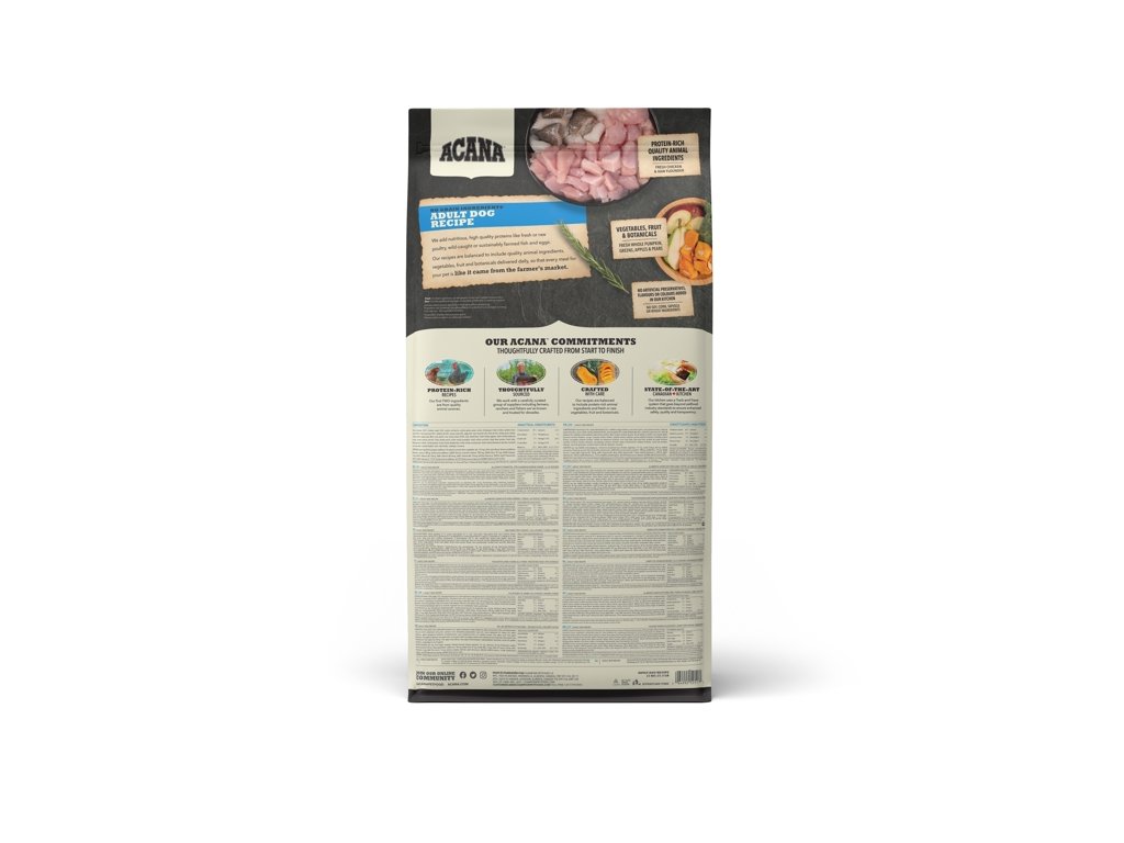 PŘIPRAVOVÁNO V NAŠICH OCEŇOVANÝCH KUCHYNÍCH V KANADĚ. ACANA ADULT PŘEKYPUJE ČERSTVÝMI MÍSTNÍMI SUROVINAMI VČETNĚ VOLNĚ CHOVANÝCH KUŘAT, VAJEC Z HNÍZDNÍCH CHOVŮ, PLATÝSE LOVENÉHO VOLNĚ V PŘÍRODĚ A NA SLUNCI ZRAJÍCÍHO OVOCE A ZELENINY – VŠECHNY SUROVINY DODÁVAJÍ VÝŽIVU A CHUTNOST A ZAJIŠŤUJÍ TAK VRCHOLOVOU KONDICI VAŠEHO PSA. PŘEČTĚTE SI NAŠE SLOŽENÍ A MYSLÍME, ŽE S NÁMI BUDETE SOUHLASIT.