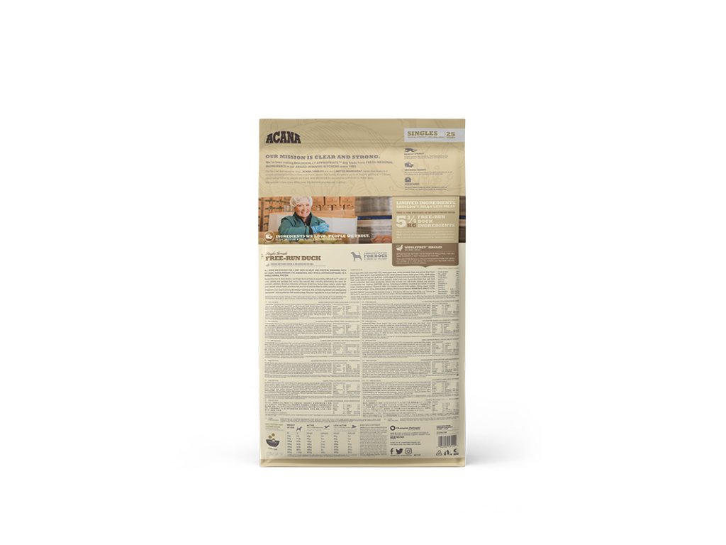 Krmivo s jediným zdrojem živočišného proteinu ACANA FREE-RUN DUCK obsahuje 50 % volně chovaných kachen, které jsou nám dodávané čerstvé v podílu celé kořisti. Díky obsahu mrazem sušených jater chutná i vybíravým jedlíkům. Čerstvé hrušky, dýně a máslová dýně poskytují rozpustnou vlákninu, což prospívá psům s citlivým zažíváním.