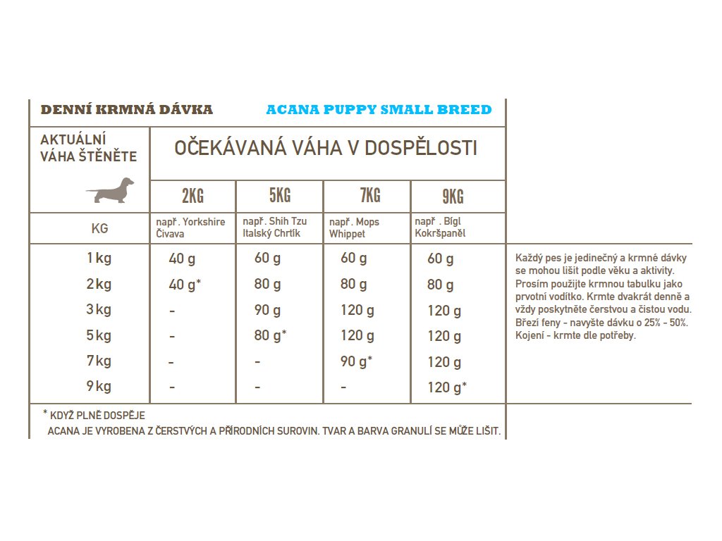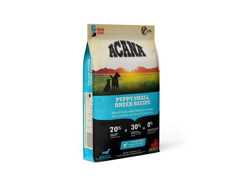 PŘIPRAVOVÁNO V NAŠICH OCEŇOVANÝCH KUCHYNÍCH V KANADĚ. ACANA PUPPY SMALL BREED PŘEKYPUJE VOLNĚ CHOVANÝMI KUŘATY, VEJCI Z HNÍZDNÍCH CHOVŮ, PLATÝSEM LOVENÝM VOLNĚ V PŘÍRODĚ A NA SLUNCI ZRAJÍCÍM OVOCEM A ZELENINOU – VŠE DODÁVÁNO ČERSTVÉ Z NAŠEHO REGIONU. ACANA ZARUČUJE, ŽE UDRŽÍ VAŠE ŠTĚNĚ SPOKOJENÉ, ZDRAVÉ A SILNÉ. PŘEČTĚTE SI NAŠE SLOŽENÍ A MYSLÍME, ŽE S NÁMI BUDETE SOUHLASIT.