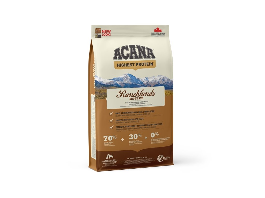 ACANA RANCHLANDS OBSAHUJE ANGUSKÉ HOVĚZÍ, VOLNĚ CHOVANÁ JEHŇATA, BIZONY A YORKSHIRSKÉ VEPŘOVÉ, VŠE DODÁVANÉ ČERSTVÉ NEBO SYROVÉ Z NAŠEHO REGIONU V PODÍLU CELÉ KOŘISTI, COŽ DODÁVÁ ŽIVINY PŘIROZENĚ, BEZ POTŘEBY DLOUHÉHO SEZNAMU UMĚLÝCH DOPLŇKŮ. S NÍZKÝM OBSAHEM SACHARIDŮ A VYSOKÝM OBSAHEM ŽIVOCIŠNÝCH PROTEINŮ PRO DOSAŽENÍ VRCHOLOVÉ KONDICE.