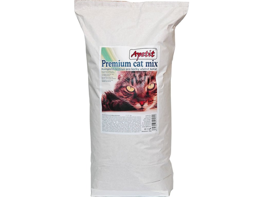 Apetit Premium Cat mix je kompletní krmivo představující optimální a vyváženou stravu pro spokojený život všech koček a koťat. Vysoce stravitelné krmivo s hovězím a drůbežím masem nejen dobře chutná, ale současně poskytuje kočce vhodnou výživu, která zajišťuje vynikající vitalitu a zdraví.