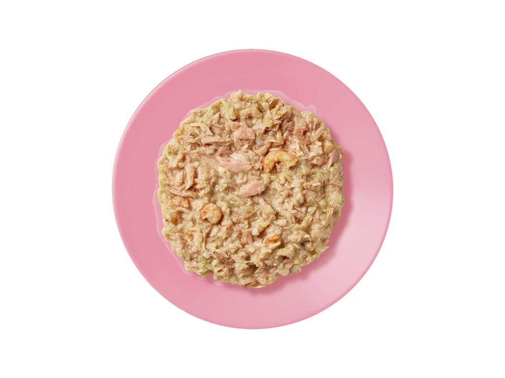 55% tuňák, rybí vývar, 20% krevety, rýže.