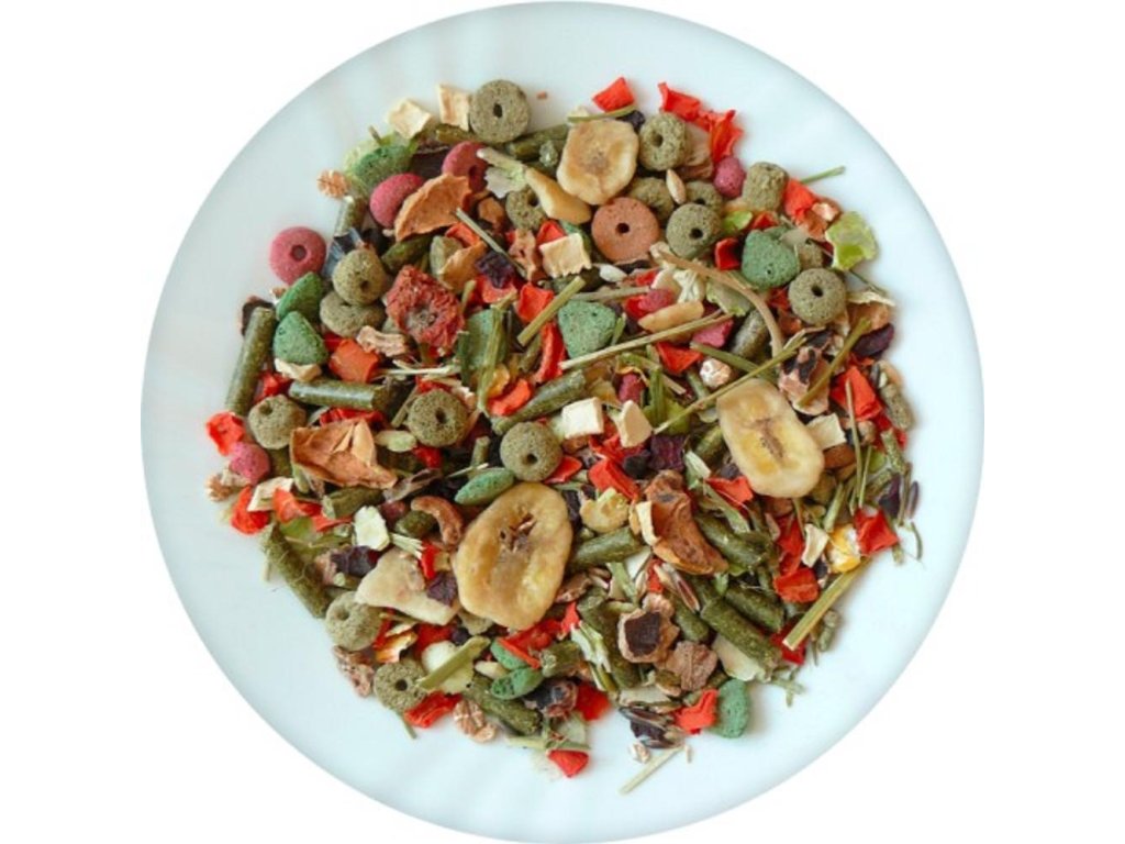 Složení: vojtěška, zelenina (mrkev, červená řepa, pastiňák, petržel), extrudovaná pšeničná mouka, extrudovaná kukuřičná mouka, hrachové vločky, svatojánský chléb, ovoce (jablka, banány), extrudovaná hrachová mouka, jablečná vláknina