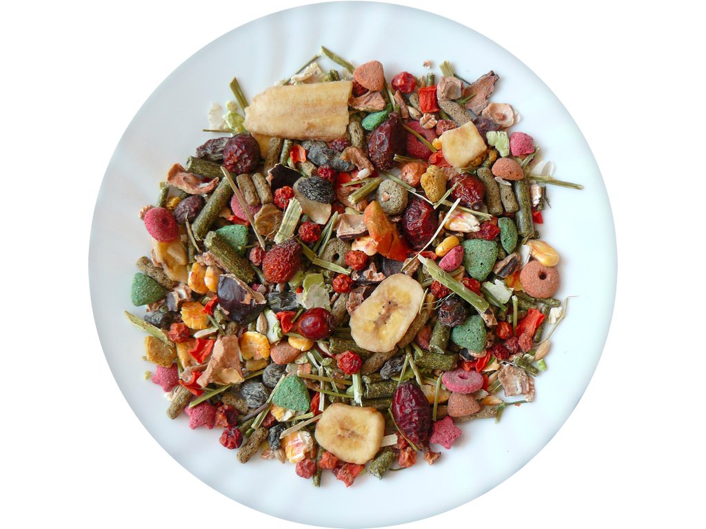 Složení: vojtěška, ovoce (šípky, jeřabiny, jablka, rozinky, banán), hrachové vločky, seno, rohovník obecný, pšenice, zelenina (mrkev, petržel), kukuřice, ječmen, bylinky