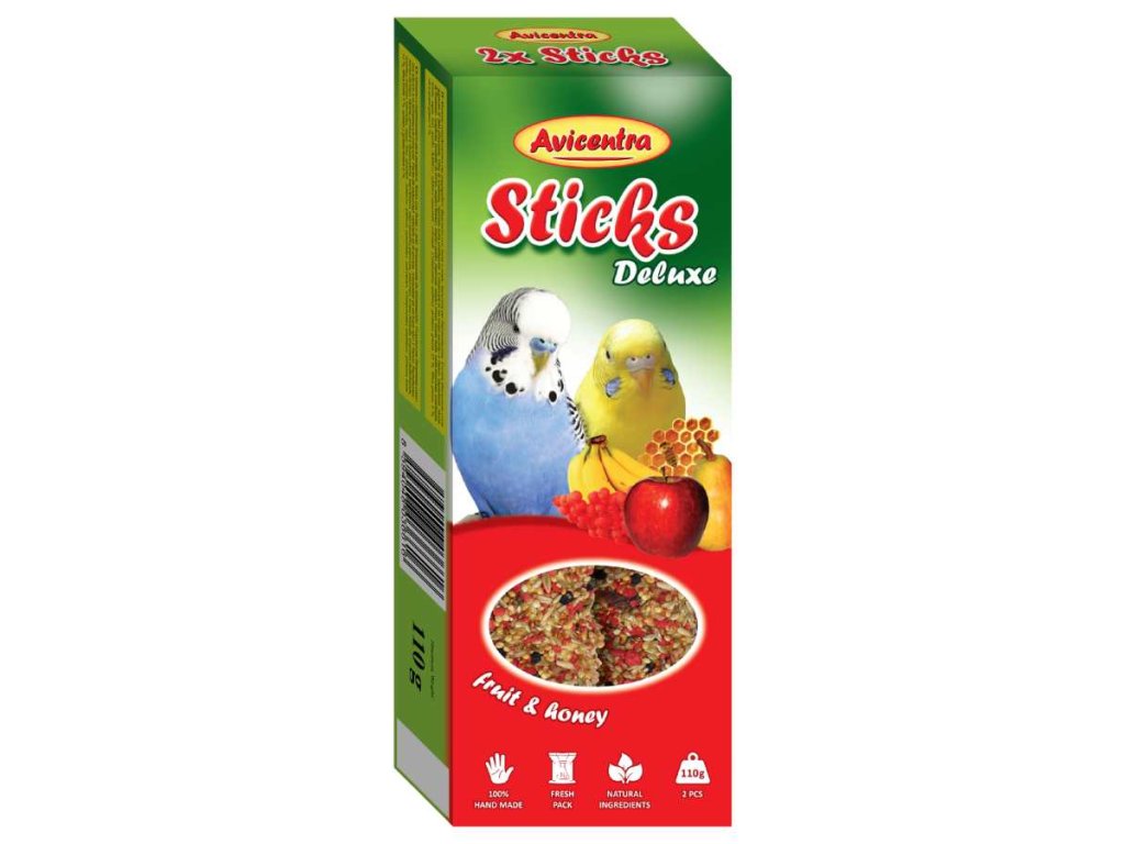 Tyčinky jsou vyrobeny z bohaté směsi zrnin a dalších přírodních surovin, včetně medu, a přirozenými zdroji vitamínů A, C, D, E, řady B a minerálů, a proto jsou nepostradatelným doplňkem každodenní stravy. Tyčinky nutí Vašeho malého přítele, tak jako v přirozeném prostředí, vyvinout úsilí k získání potravy, a tím přinášejí zabavení pro zkrácení dlouhé chvíle.