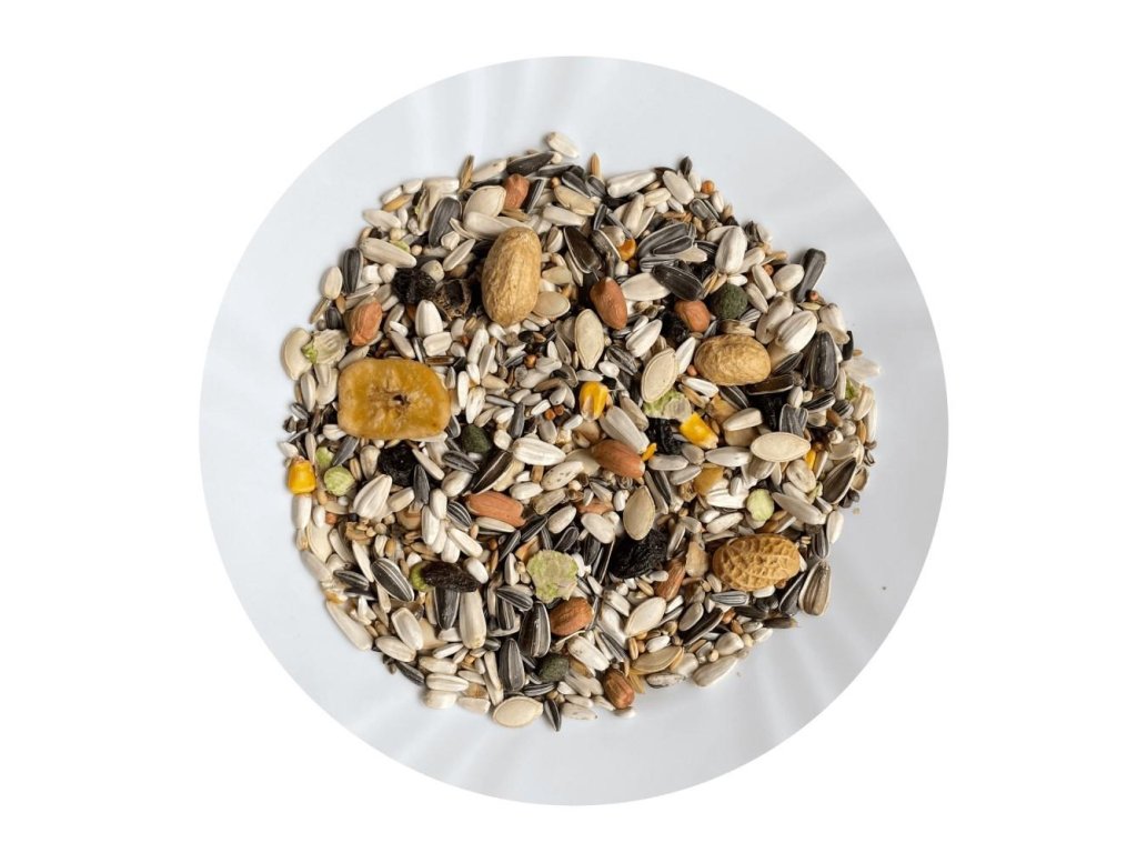 Složení: slunečnice žíhaná velkozrnná, slunečnice bílá, slunečnice žíhaná, kardi, pohanka, čirok, dari, kukuřice žlutá, kukuřice červená, nahý oves, oves setý, oves setý černý, semenec, buráky ve slupce, buráky loupané, dýně, cedrové ořechy