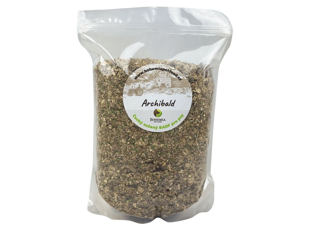 První české kompletní míchané krmivo svého druhu jménem Archibald. Směs je vyrobena z lokálního hovězího a vepřového masa s bramborovými vločkami. Očekávejte skutečné ingredience, žádné granule. Krmivo je 100% čisté, bez umělých doplňkových látek.