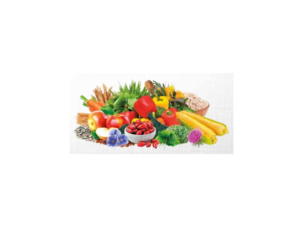 Složení v 1kg: vojtěška, byliny (kopřiva, pampeliška, jitrocel), kukuřice, sušená jablka, pšenice, mrkev, šípky, lněné semínko, pivovarské kvasnice, spirulina, extrakt z papriky, mannanoligosacharidy 75mg, fruktooligosacharidy 50mg, ostropestřec mariánský 50mg, extrakt z juky schidigera 45mg