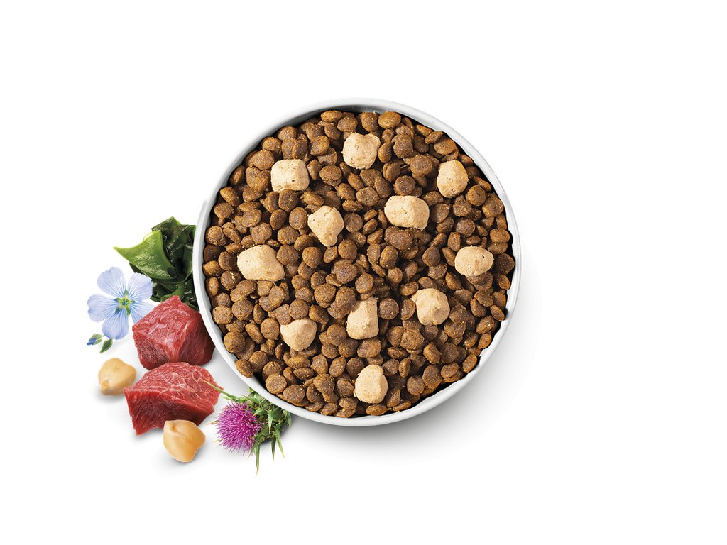 Složení: hovězí protein (30 %), čerstvé hovězí (15 %), žlutý hrách, hovězí tuk, mrazem sušené hovězí (6 %), cizrna, pohanka, sušená jablka, lněné semínko (3 %), lososový olej (2 %), lignocelulóza (1 %), probiotika (inaktivovaný Lactobacillus helveticus HA – 122, 15x109 buněk/kg), pivovarské kvasnice, sušené řasy (0,5 %, Ascophyllum nodosum), hydrolyzované schránky korýšů (zdroj glukosaminu, 260 mg/kg), sušené borůvky (230 mg/kg, zdroj polyfenolů 70 mg/kg a flavonoidů 30 mg/kg), extrakt z chrupavky (zdroj chondroitinu, 160 mg/kg), mannan-oligosacharidy (150 mg/kg), frukto-oligosacharidy (100 mg/kg), juka schidigera (100 mg/kg), inulin (90 mg/kg), semena ostropestřce mariánského (75 mg/kg), sušený rakytník řešetlákový (75 mg/kg), sušený heřmánek (30 mg/kg), sušený hřebíček (30 mg/kg), sušená šalvěj (25 mg/kg).