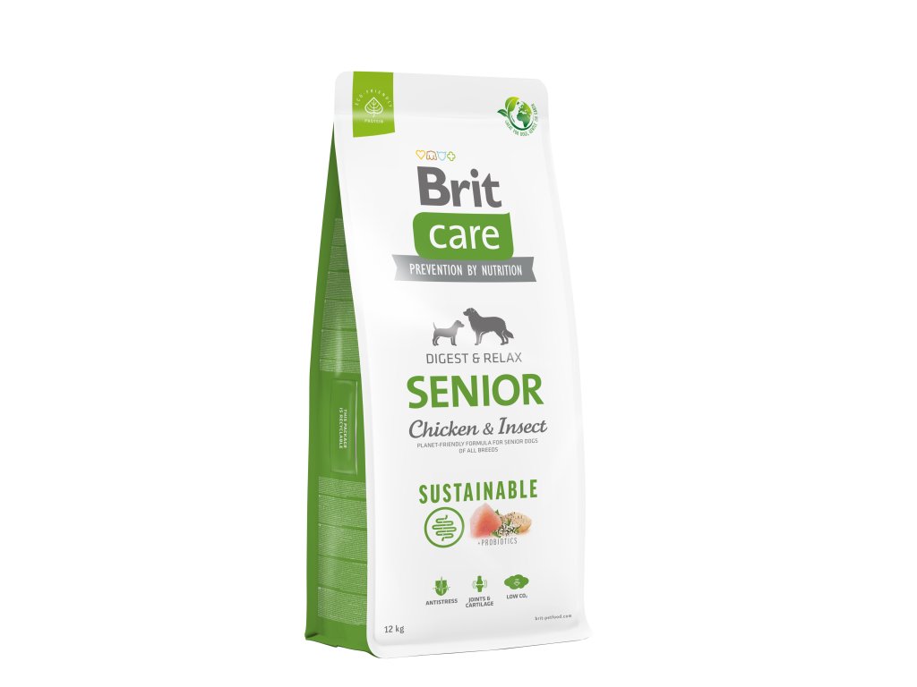 Brit Care Dog Sustainable Senior. Receptura z udržitelných zdrojů surovin Kuře a hmyz pro staré psy všech plemen (nad 7 let). Kompletní krmivo pro psy.