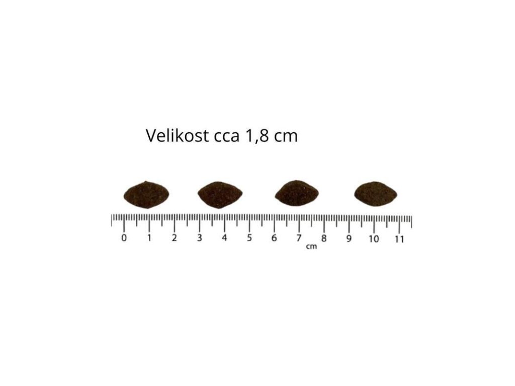 hrubý protein 25,0 %, obsah tuku 8,0 %, vlhkost 10,0 %, hrubý popel 7,6 %, hrubá vláknina 6,5 %, vápník 1,6 %, fosfor 1,2 %, omega-3 0,1 %, omega-6 0,7 %.