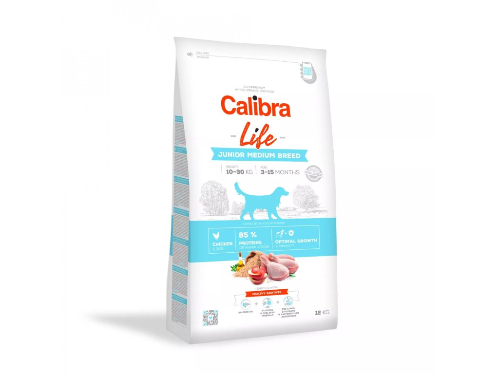 Calibra Dog Life Junior Medium Breed Chicken je hypoalergenní krmivo pro mladé psy (3–15 měsíců) středních plemen (10–30 kg) s kuřecím masem. O vysoké výživové hodnotě krmiva tolik potřebné pro správný růst psa vypovídá i obsah bílkovin živočišného původu. V této receptuře tvoří 85 % z celkového obsahu bílkovin. Receptura je sestavena jako monoproteinová - pouze jeden zdroj živočišných bílkovin. Granule jsou lehce stravitelné, s nízkým obsahem obilovin – pouze s rýží. Díky vysoce kvalitním surovinám a pečlivě vybraným aditivům mají příznivý vliv na růst a celkový vývoj psa. Přidali jsme prebiotika a probiotika pro zdravé zažívání a posílení imunitního systému, lososový olej pro péči o zdravou kůži a zářivou srst a vitaminy a minerály pro správnou funkci celého organismu.