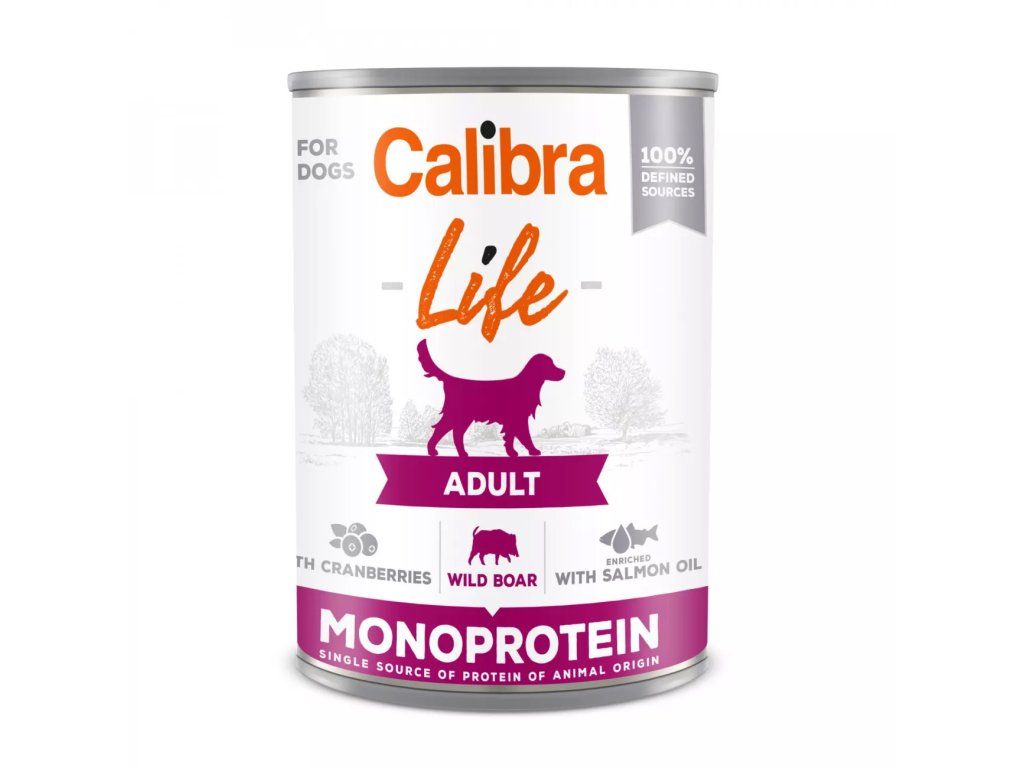 Calibra Dog Life Adult Wild Boar with Cranberries - receptura konzervy s kančím a brusinkami je kompletním krmivem, které je určené pro dospělé psy.