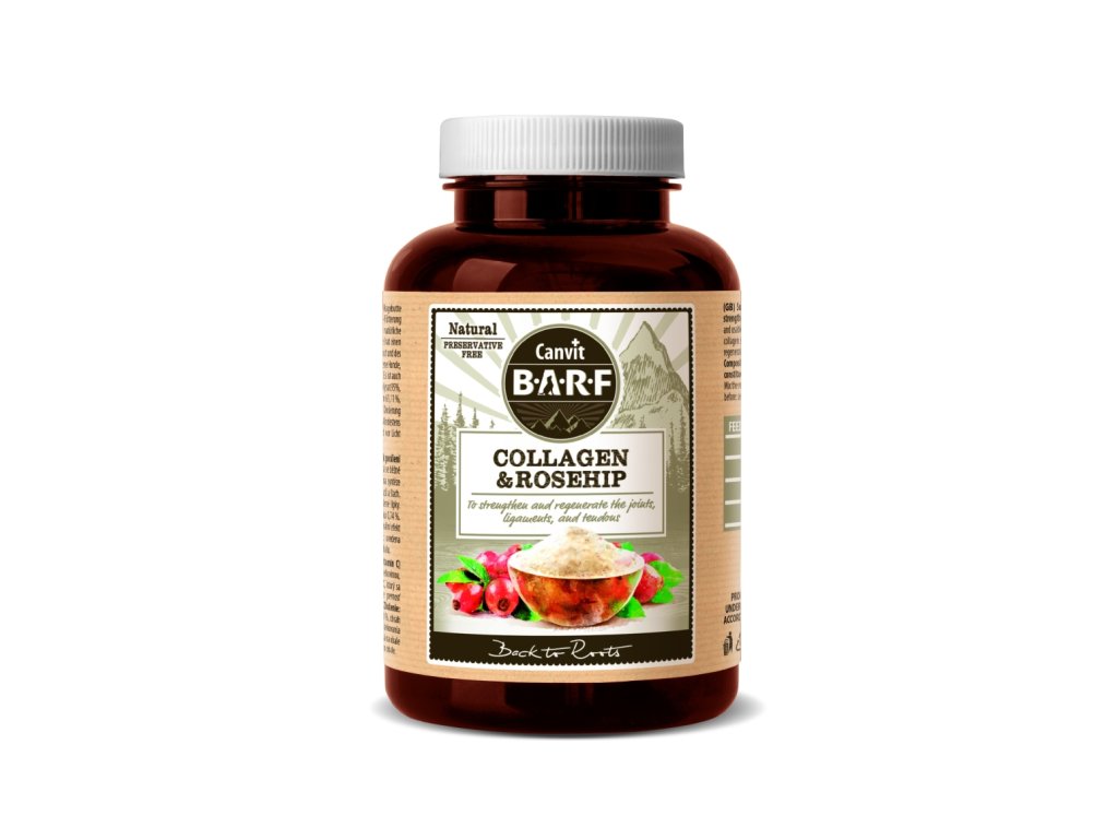 Canvit BARF Collagen & Rosehip je 100% přírodní zdroj vysoce stravitelného kolagenu a vitamínu C ze šípku pro intenzivní podporu zdraví kloubů a pohybového aparátu u psů a koček.