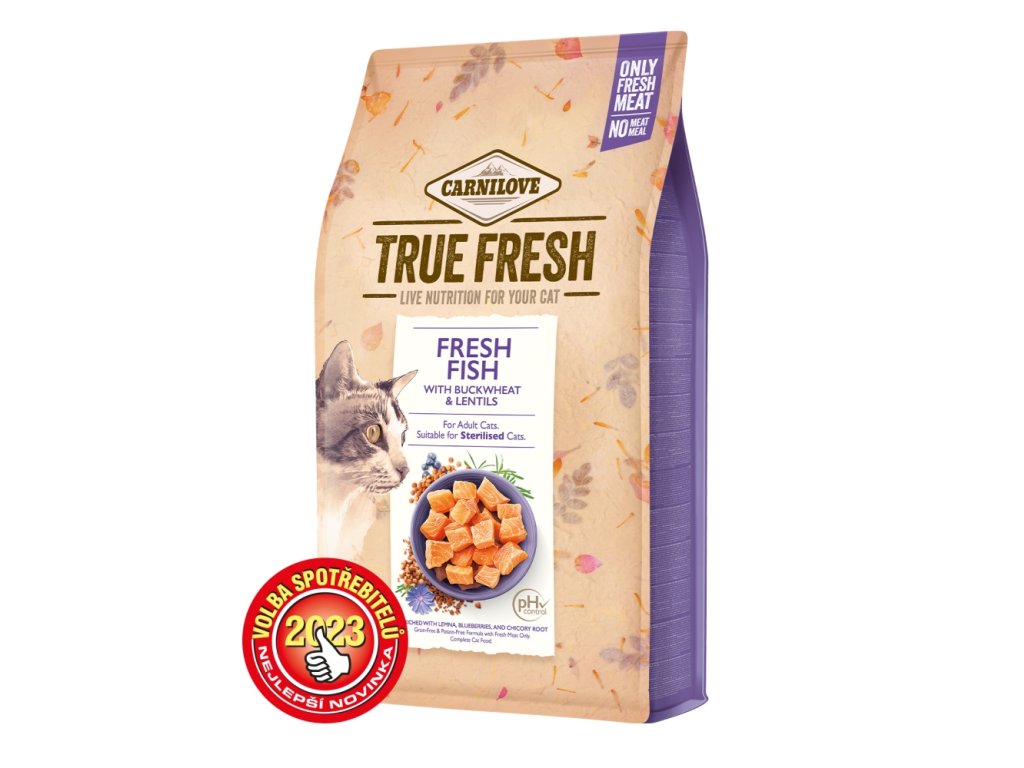 CARNILOVE TRUE FRESH FISH. Receptura bez obilovin a brambor pouze s čerstvým masem pro dospělé kočky. Vhodné pro kastrované kočky. Kompletní krmivo pro kočky.