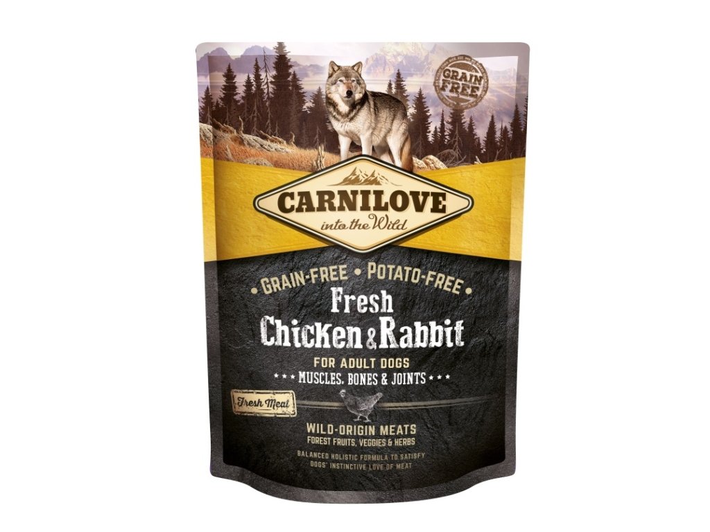 Carnilove Fresh Kuře & Králík superprémiové, holistické krmivo bez obilovin a brambor s čerstvým masem pro dospělé psy. Krmivo bylo navrženo s respektem k původní přirozenosti psů tak, aby jim poskytl vyváženou stravu bohatou na čerstvé maso v kombinaci s různými druhy zeleniny, ovoce a bylin