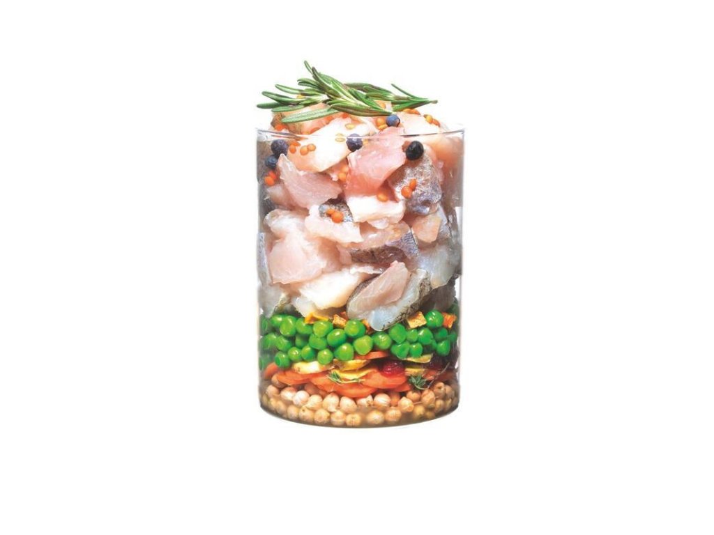 Složení: čerstvá ryba (60 %), hrách, kuřecí tuk (konzervováno tokoferoly), cizrna (4 %), sušená jablka (4 %), červená čočka, dýně, lososový olej (3 %), přírodní aroma, mrkev, sušené vaječné skořápky, protein okřehku (0,5 %), spirulina (0,3 %), sušený rakytník řešetlákový (0,2 %), sušený kořen zázvoru (0,1 %), sušené borůvky (0,1 %), sušený rozmarýn (0,1 %), sušené brusinky (0,1 %), sušený tymián (0,1 %), glukosamin (0,026 %), slávka zelenoústá (0,025 %), chondroitin sulfát (0,016 %), pivovarské kvasnice (zdroj mannanoligosacharidů, 0,015 %), kořen čekanky (zdroj fruktooligosacharidů, 0,01 %), juka schidigera (0,01 %).