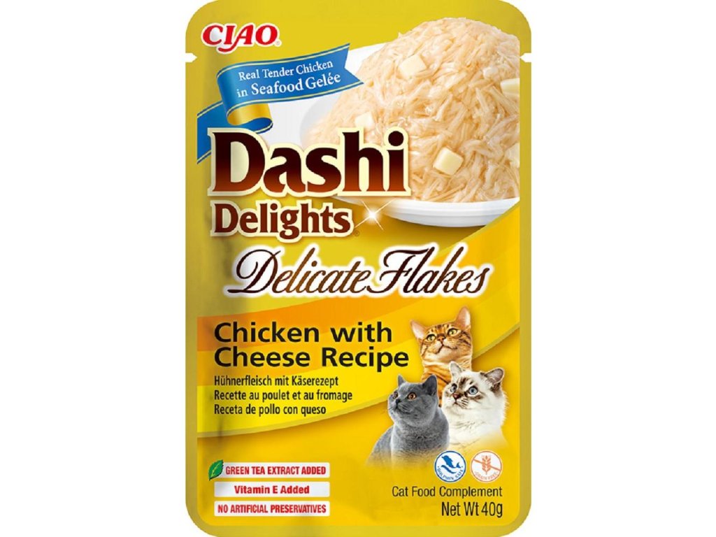 Dashi je tradiční japonský rybí vývar z vloček bonito, který je známý svou bohatou a výraznou chutí. Dashi má nízký obsah kalorií a tuku, takže je zdravým doplňkem stravy vaší kočky. Kapsičky obsahují jemné kuřecí vločky plné bílkovin smíchané s japonským vývarem Dashi a s příchutí bonito. Dashi kapsičky jsou skvělé doplňkové krmivo s vysokým obsahem vody - zpestřete stravu vašim kočičím kamarádům kapsičkou s až 86% vlhkostí. Jednoduše lahodné - čerstvé ingredience s přidaným vitamínem E pro podporu jejich imunitního systému a extraktem ze zeleného čaje jako přírodního antioxidantu.