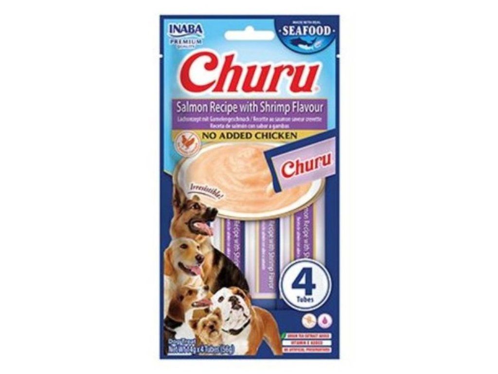 Tato receptura s lososem a s příchutí krevet obsahuje 4 lahodné krémové pamlsky vyrobené z volně žijících lososů a to bez obilovin, konzervantů a umělých barviv. Churu můžete podávat přímo z ruky, samostatně z misky nebo jsou ideální do lízací podložky. Pamlsky Churu mají vysoký obsah vody a díky tomu jsou vhodným doplňkem k suchému krmivu, pro rychlé doplnění tekutin a pro psy, kteří málo pijí. Pamlsky Churu jsou 100% přírodní a zdravé mlsání pro psy všech věkových kategorií. Churu jsou také ideální pro ukrytí tablety na odčervení či jiného léku, který je potřeba psovi nenásilně podat.