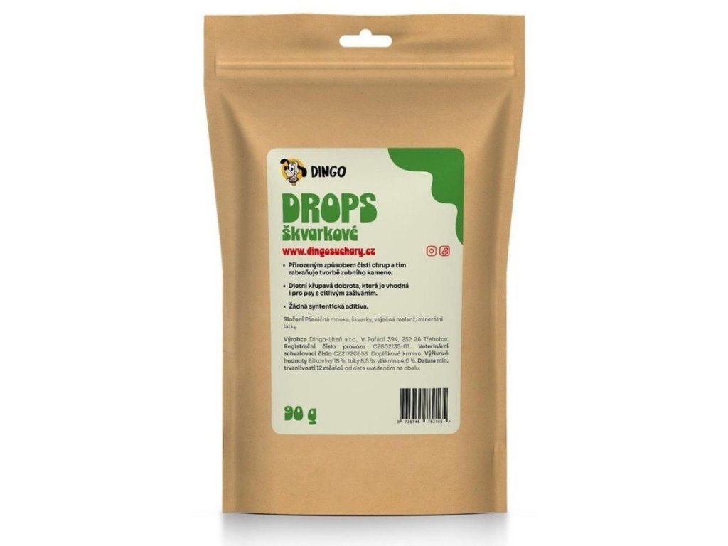 Pomalu pečené DINGO škvarkové drops jsou vyrobeny z kvalitních lokálních surovin. Přirozenou cestou čistí zuby vašeho mazlíčka a tím se zabraňuje tvorbě zubního kamene, jsou lehce stravitelné bez přidaných konzervantů a aditiv. Dietní křupavé pečivo je vhodné i pro psy s citlivým zažíváním. Kvalitní doplněk stravy vhodný pro všechna plemena psů.