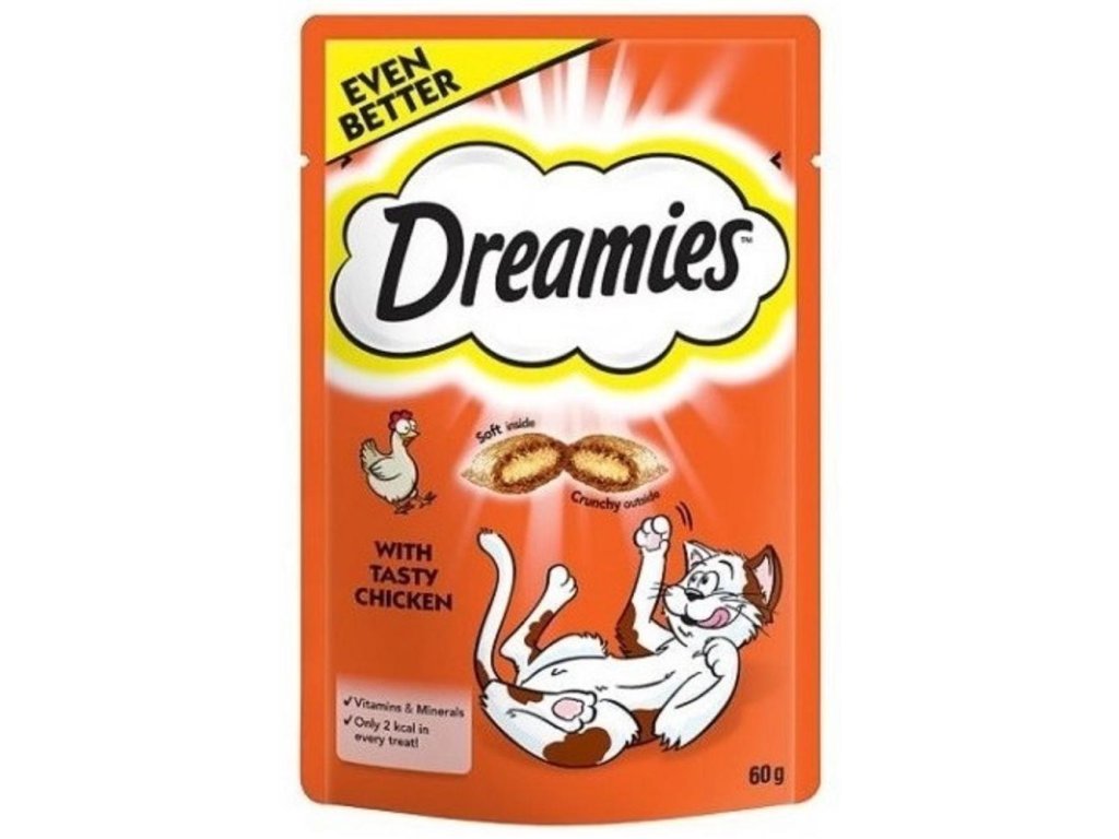 Dreamies křupavé polštářky plněné jemným krémem s kuřecí příchutí. Kočky šílí po neodolatelné chuti kočičích pamlsků DREAMIES. Lahodné a křupavé zvenku, měkké uvnitř – kočky jednoduše nedokáží odolat skvělé chuti DREAMIES. Tak jen do toho, zatřeste sáčkem a sledujte, jak se k vám vaše kočka rozběhne.