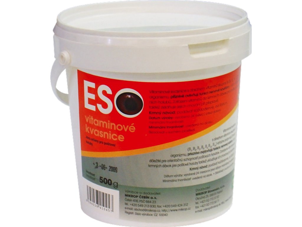 Vitamínové kvasnice ESO jsou určené pro poštovní holuby. Vitamíny skupiny B (B1, B2, B3, B5, B6, B12, B15) podporují dobré fungování nervové soustavy, což je důležité pro orientační schopnosti poštovních holubů. Kvasnice také zklidňují chování holubů při přepravě.Krmný návod: podávat každodenně