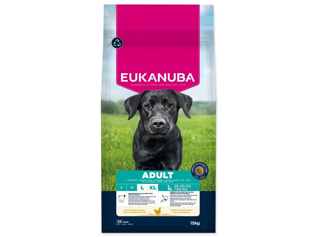 EUKANUBA Life Care nabízí vědecky podloženou prémiovou výživu, která je navržena tak, aby splňovala měnící se potřeby psů v každé fázi života. Toto suché krmivo s čerstvým kuřecím masem je odborně sestaveno tak, aby splňovalo nutriční potřeby dospělých psů velkých plemen od 18 měsíců do 6 let (nebo od 2 do 5 let u obřích plemen). Prémiové složení obsahuje L-karnitin, který podporuje metabolismus tuků, pomáhá psovi udržovat optimální hmotnost a snižuje zátěž kloubů pro lepší pohyblivost a pohodlí. Krmivo dále obsahuje glukosamin a vápník pro udržení zdravých kloubů a silných kostí. Na míru sestavená směs vlákniny s prebiotiky, fruktooligosacharidy a řepnou dužinou podporuje zdravé trávení a zajišťuje maximální využití krmiva. Přírodní zdroje omega-6 a omega-3 mastných kyselin přispívají ke zdravé kůži a lesklé srsti, zatímco antioxidanty jako vitamín E podporují silný imunitní systém. Jedinečné šestihranné granule v kombinaci se systémem dentální péče DentaDefense aktivně udržují zuby psa čisté a zdravé a snižují tvorbu zubního kamene v průběhu času. Toto 100% kompletní a vyvážené krmivo poskytuje pokročilou výživu pro dospělé psy velkých plemen, podporuje optimální tělesnou kondici, celoživotní zdraví a celkovou pohodu. EUKANUBA poskytuje vašemu psovi kvalitní výživu přizpůsobenou každé fázi jeho života.