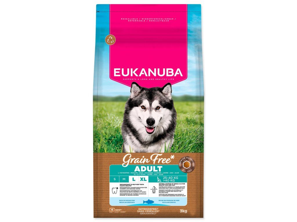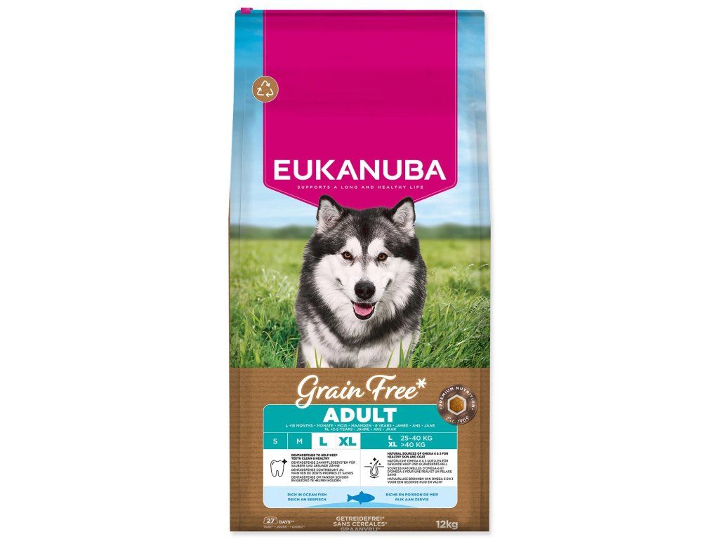 Toto suché krmivo EUKANUBA Grain Free* je speciálně vyvinuto pro dospělé psy velkých plemen od 18 měsíců do 6 let (nebo od 2 do 5 let u obřích plemen). Složení s nízkým obsahem alergenů a bohatým obsahem mořských ryb je pečlivě navrženo pro psy s citlivostí na obiloviny a podporuje jejich jedinečné nutriční potřeby. Složení bez kuřecího masa nabízí plnohodnotnou výživu s alternativními zdroji sacharidů, včetně hrachu a bezlepkových sladkých brambor*, které poskytují přírodní vlákninu, základní vitamíny a antioxidanty. Krmivo je nabité mořskými rybami a dodává vašemu psovi kvalitní živočišné bílkoviny nezbytné pro budování a udržení silných, štíhlých svalů. Pro další podporu zdravého trávení obsahuje krmivo prebiotické fruktooligosacharidy a řepnou dužinu. Přírodní zdroje omega-6 a omega-3 mastných kyselin navíc podporují zdravou kůži a lesklou srst, zatímco vápník a glukosamin udržují pevné kosti a klouby a přispívají k celkové pohyblivosti psa. Jedinečný tvar granulí v kombinaci s technologií DentaDefense pomáhá udržovat zuby čisté a zdravé. Toto 100% kompletní a vyvážené krmivo poskytuje pokročilou výživu pro dospělé psy velkých plemen, podporuje optimální tělesnou kondici, celoživotní zdraví a celkovou pohodu. Krmivo EUKANUBA poskytuje kvalitní výživu přizpůsobenou výživovým potřebám vašeho psa.