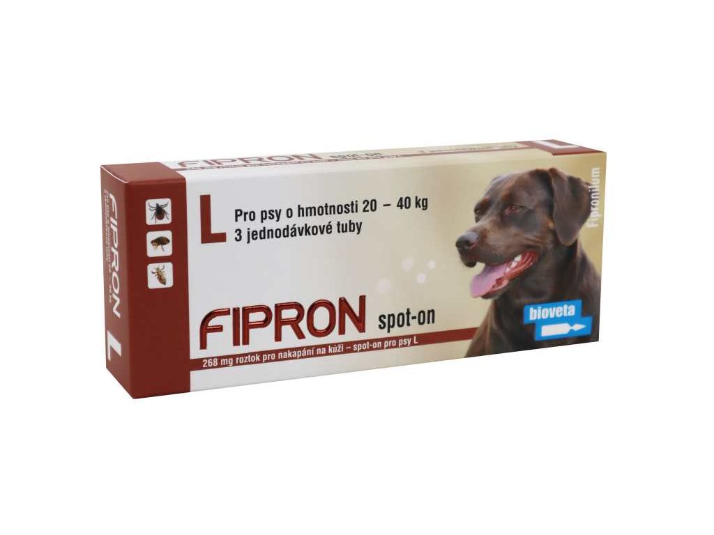 Psi o hmotnosti nad 20 a do 40 kg: obsah jedné tuby o objemu 2,68 ml (L). Takto zajistíte minimální doporučenou dávku fipronilu 6,7 mg/kg ž.hm.