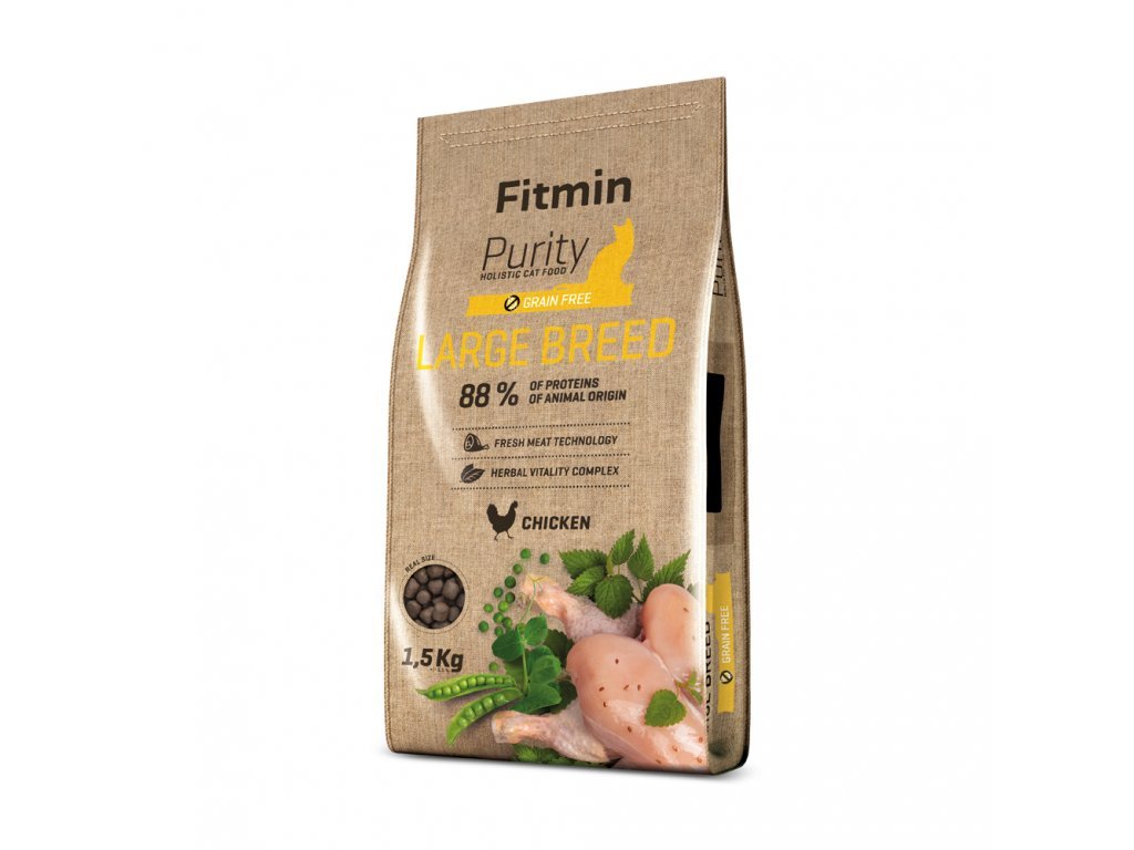 Kulinářský zážitek pro Vaši kočku. To je krmivo Fitmin cat Purity Large Breed. Jedná se o holistické granule pro velké kočky, ve kterých najdete čerstvé kuřecí maso, bylinky na podporu vitality organismu, ovoce i zeleninu. Nejenže uspokojíte mlsné jazýčky Vašich koček, ale zároveň jim poskytnete prvotřídní kvalitu. Krmivo pro velké kočky Fitmin cat Purity Large Breed je tzv. Grainfree krmivo, to znamená, že neobsahuje obiloviny, je bezlepkové, čímž snižuje potencionální riziko výskytu alergických reakcí (např. na pšeničný lepek a kukuřičný gluten). Krmivo je svým unikátním složením a velikostí granule ideální pro kočky velkých plemen jako je Mainská Mývalí kočka, Ragdoll nebo norská lesní kočka. Krmivo Fitmin cat Purity Large Breed pro velké kočky je ve tvaru větší granule, kterou kočka musí rozkousnout. Díky krmivu bude kočka ve vynikající kondici, v neposlední řadě má krmivo důležitou detoxikační funkci díky bylinné směsi, která má ovšem i mnoho dalších blahodárných účinků. Granule pro velké kočky Fitmin cat Purity Large Breed jsou vyráběny nejmodernějšími technologiemi, jsou vyvážené, obsahují vysoký podíl živočišných složek a mnoho dalších benefitů - zejména komplex dentální péče, prebiotika, cheláty a další.