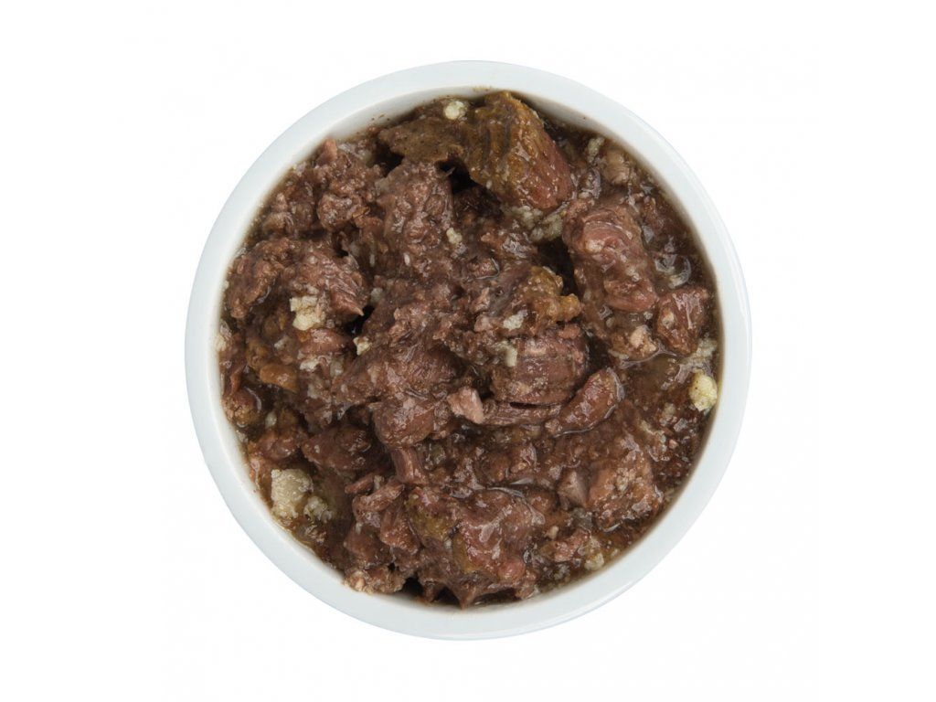 Šťavnatá konzerva pro dospělé psy s kousky hovězího masa a jater
