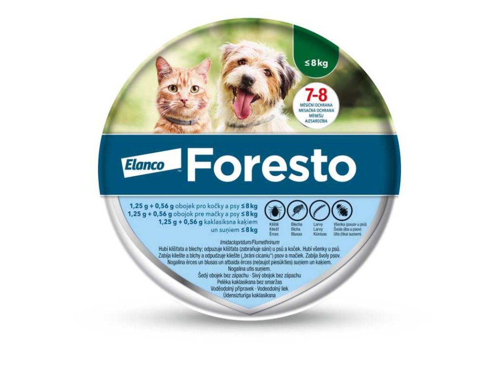 Pro kočky a menší psy do hmotnosti 8 kg použijte Foresto obojek o délce 38 cm.