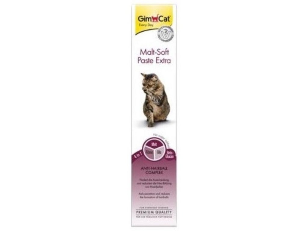 GimCat Malt-Soft-Extra obsahuje čistý přírodní aromatický slad a rostlinný olej. V kombinaci s vlákninou podporuje Malt-Soft-Extra průchod potravy a přirozené vylučování spolknutých chlupů a nestravitelných částic.
