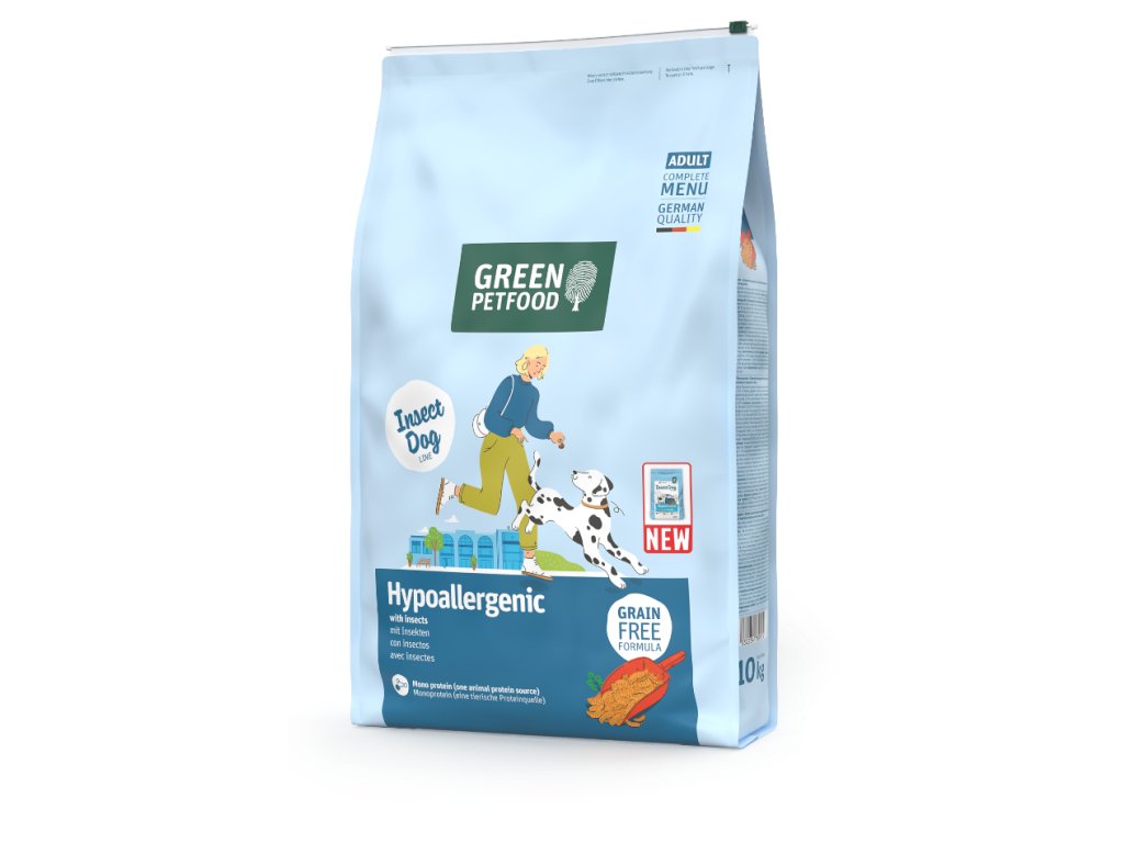 Ideální alternativa pro ty psí jedince, kteří trpí alergiemi a intolerancemi na běžné druhy mas nebo masitou stravu: Green Petfood InsectDog hypoalergenní obsahuje 100% hmyzí bílkoviny, která slouží jako zdroj kvalitních stavebních kamenů bílkovin a mastných kyselin. Hmyz se do krmiv pro psy používá velmi zřídka, krmivo je tak hypoalergenní a výborně ho snáší i velmi citlivá zvířata. Chov hmyzu navíc způsobuje nízké emise CO2, a proto je výroba krmiva šetrná k životnímu prostředí. Kromě hmyzí bílkoviny, která představuje jedinečný zdroj živočišných bílkovin, obsahuje krmivo zeleninu, slunečnicový olej a vyváženou kombinaci životně důležitých látek. Obiloviny nejsou v krmivu obsaženy. Organismus psa tak bude zásoben potřebnými vitamíny, minerálními látkami a stopovými prvky. Krmivo obsahuje prvotřídní suroviny a při výrobě nebyly použity žádná barviva, ochucovadla či konzervační látky.