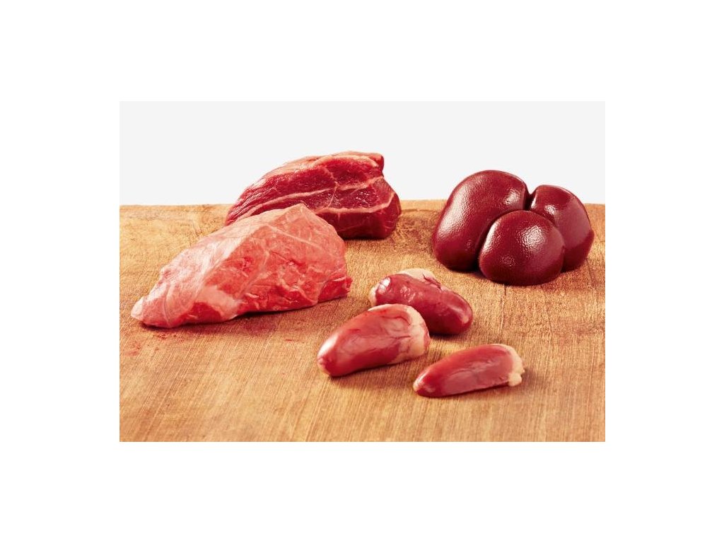 Složení: hovězí 40% (plíce, maso, játra, srdce, ledviny, vemeno), vývar 31%, krůtí 14% (maso, srdce, játra), kachní 8% (srdce, krk)