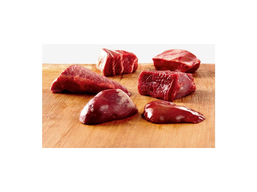 Složení: hovězí 52% (játra, plíce, maso, ledviny, srdce, vemeno), kuřecí 8% (srdce), krůtí 5% (srdce), zvěřina 4% (maso), uhličitan vápenatý