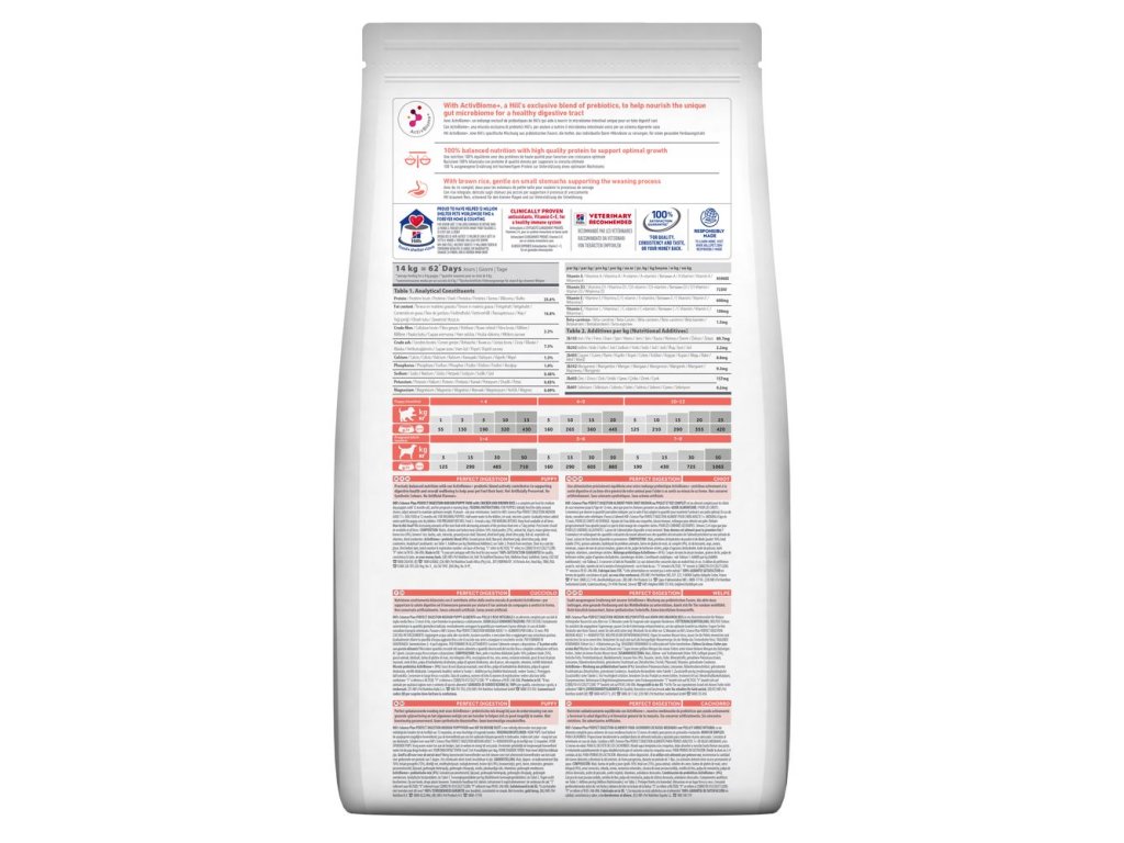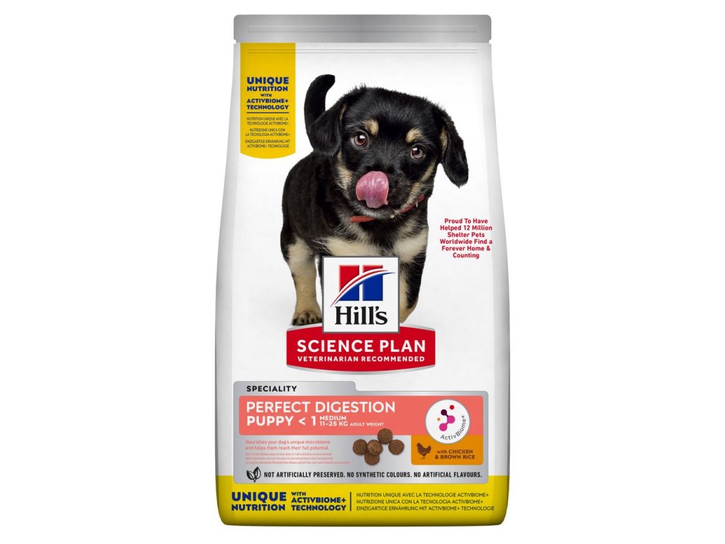 Hill's Science Plan PERFECT DIGESTION krmivo pro štěňata středních plemen s kuřetem a hnědou rýží obsahuje ActivBiome+, což je exkluzivní směs prebiotik společnosti Hill's, která vyživuje unikátní střevní mikrobiom vašeho psa a pomáhá mu dosáhnout jeho plného potenciálu.