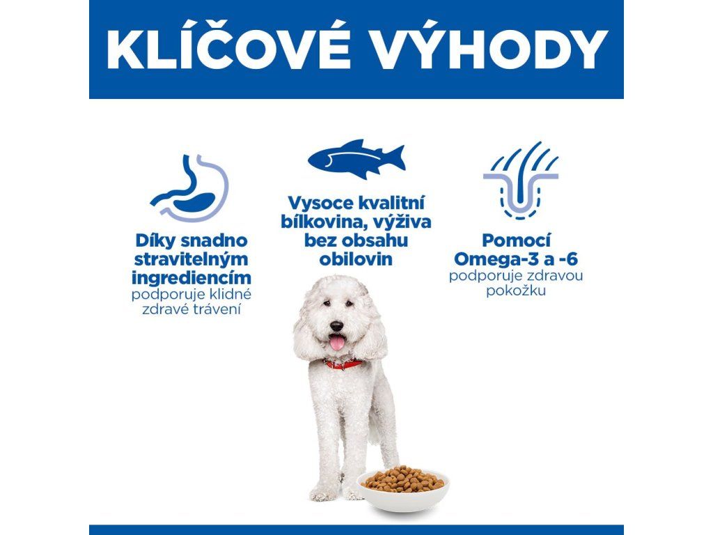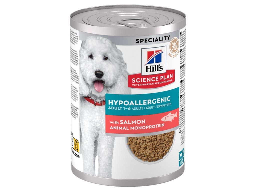 Hill's SCIENCE PLAN Hypoallergenic krmivo s lososem pro dospělé psy středně velkých plemen používá jemnou recepturu, která zahrnuje omezené zdroje nových vysoce kvalitních bílkovin, žádné obiloviny a je šitá na míru potřebám psů trpících přecitlivělostí na krmivo.