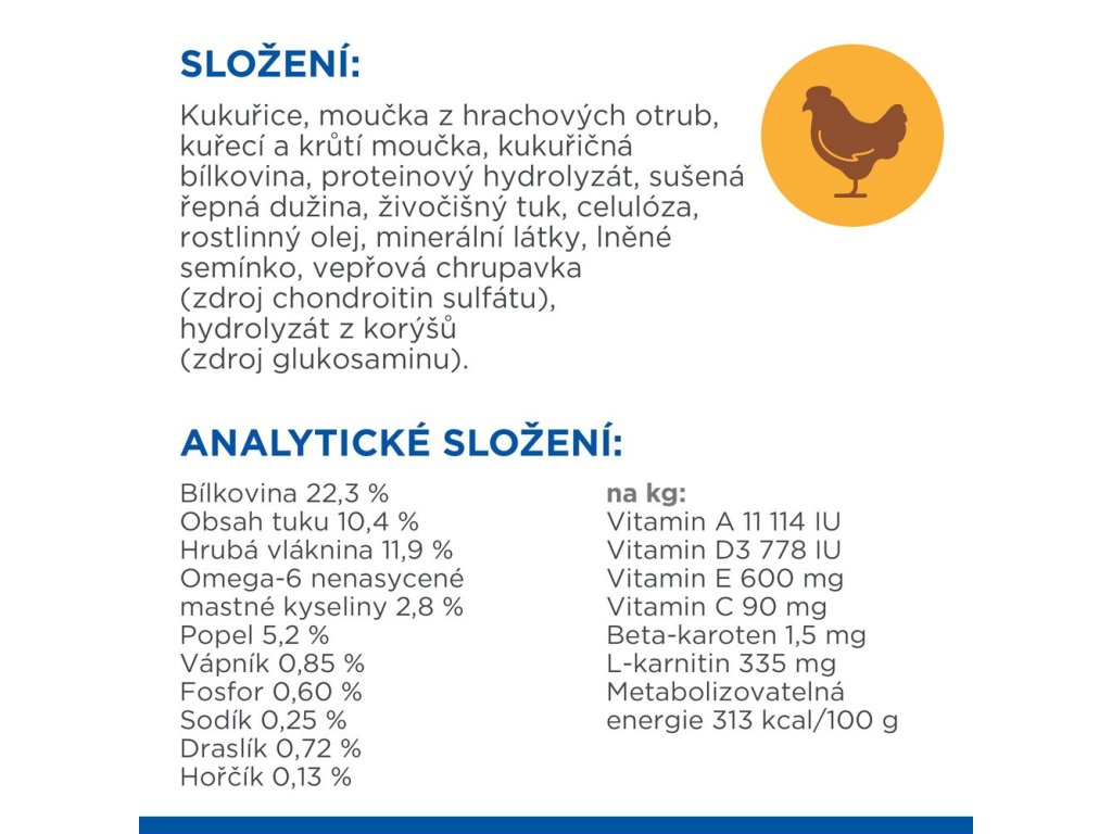 SLOŽENÍ: Kukuřice, moučka z hrachových otrub, kuřecí a krůtí moučka, kukuřičný gluten, proteinový hydrolyzát, sušená řepná dužina, živočišný tuk, celulóza, rostlinný olej, minerální látky, lněné semínko, vepřová chrupavka (zdroj chondroitin sulfátu), hydrolyzát z korýšů (zdroj glukosaminu).