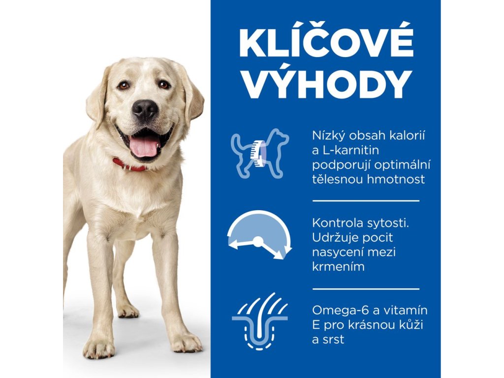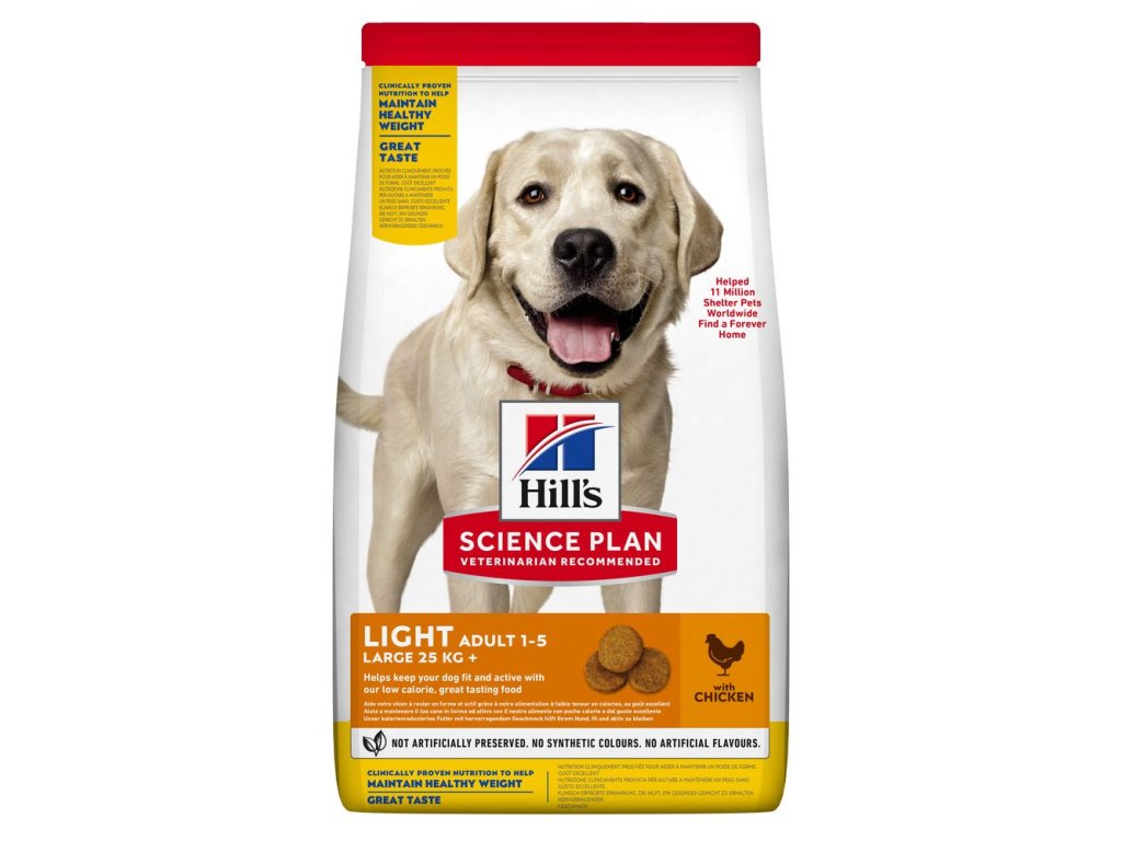 Nízkokalorické krmivo Hill's SCIENCE PLAN Light pro dospělé psy velkých plemen s kuřetem představuje přesně vyváženou výživu pro méně aktivní dospělé psy, kteří potřebují nízkokalorické krmivo, aby si udrželi zdravou hmotnost a životní styl.