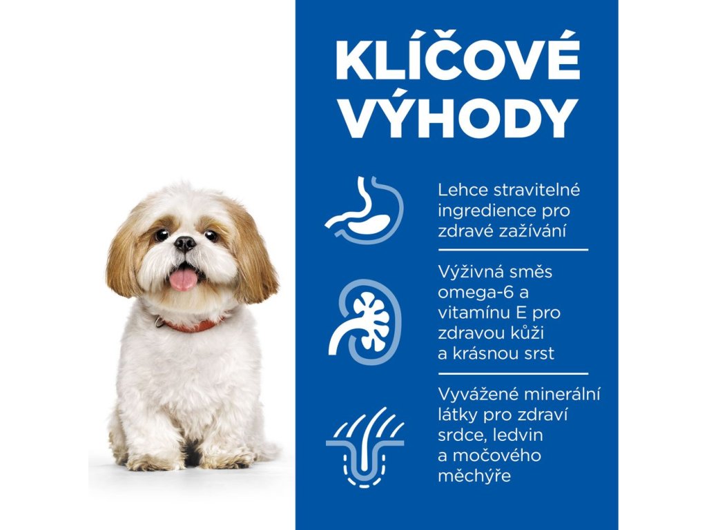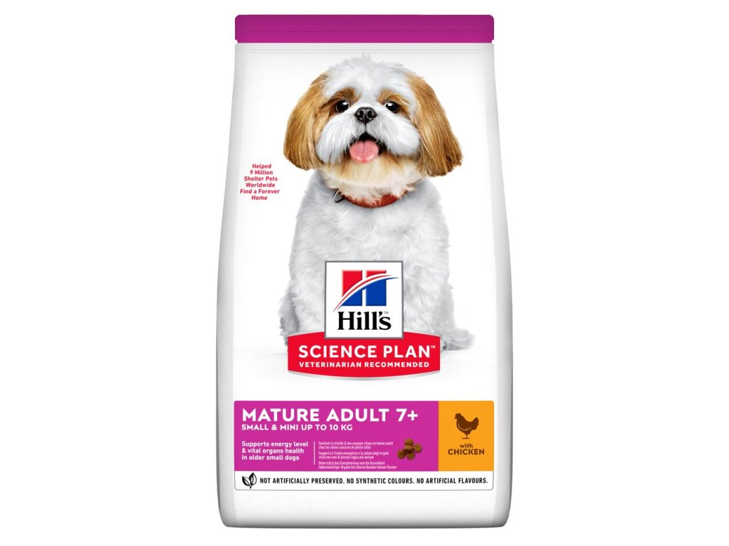 Malá velikost, velká dávka lásky. Hill's Science Plan krmivo pro malé a trpasličí starší psy 7+ s kuřetem je výživa vytvořená speciálně pro důstojné stárnutí malých a trpasličích psů. Nejmenší velikost granulí, obsahují synergickou směs živin pro energii a vitalitu.