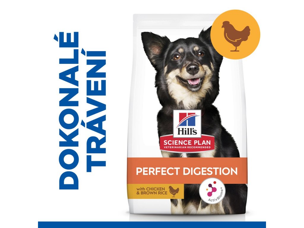 Krmivo Hill's Science Plan PERFECT DIGESTION pro dospělé psy malých a trpasličích plemen s kuřetem obsahuje ActivBiome+, exkluzívní směs prebiotik společnosti Hill's, která pomáhá rychle vyživovat a vyvažovat jedinečný mikrobiom vašeho zvířete.