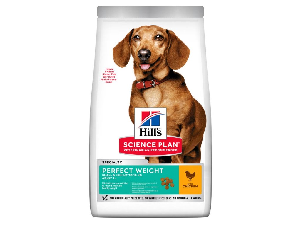 Hill's Science Plan Perfect Weight krmivo pro malé a trpasličí dospělé psy s kuřetem poskytuje lahodnou, klinicky ověřenou výživu pro dosažení a udržení zdravé váhy. Naše receptura s vysokým obsahem bílkovin a vlákniny je obohacena o L-karnitin a kokosový olej na podporu metabolismu zvířete.