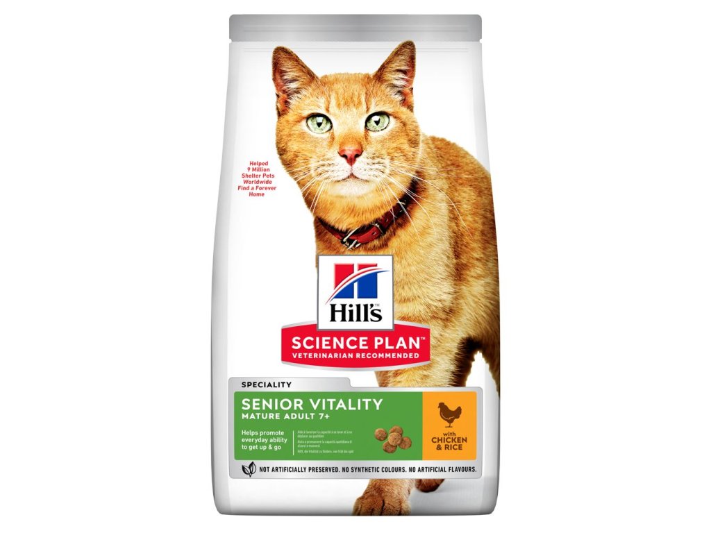 HILL'S SCIENCE PLAN Senior Vitality krmivo pro kočky poskytuje přesně vyváženou výživu, která podporuje každodenní energii a vitalitu. Jedinečná směs ingrediencí podporuje funkci mozku, interakci, energii a vitalitu Omega-3 a -6 mastné kyseliny pro krásnou srst Lehce stravitelné ingredience pro zdravé zažívání
