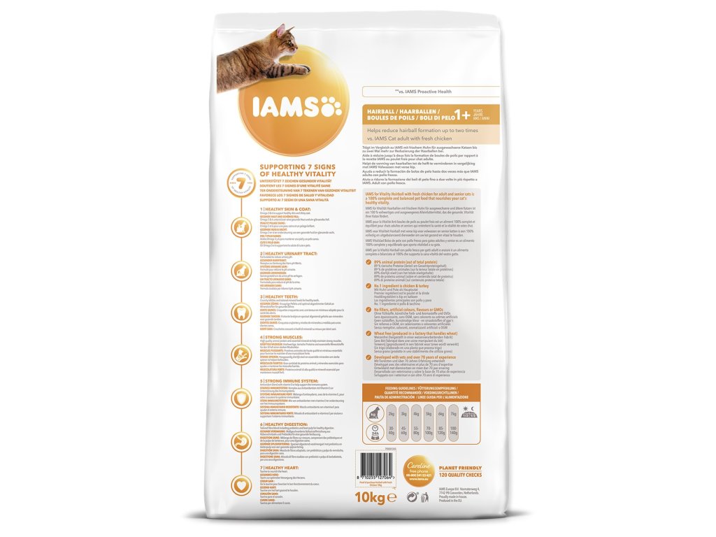 Krmivo IAMS for Vitality pro redukci chlupových bezoárů pro dospělé kočky a kočičí seniory je 100% kompletní a vyvážené, odborníky sestavené krmivo, které bude vašemu zvířeti chutnat a svědčit. Naše nová a vylepšená receptura s čerstvým kuřecím masem je založena na kvalitních živočišných bílkovinách pečlivě vybraných tak, aby u dospělých koček a kočičích seniorů podporovaly sedm znaků zdravé vitality. Aby byly kočky zdravé, aktivní a plné energie, přidáváme do svých lahodných receptur až 89 % živočišných bílkovin (z celkového obsahu bílkovin). Naše receptura pro omezení tvorby chlupových bezoárů pomáhá kočce tyto potíže lépe zvládat.