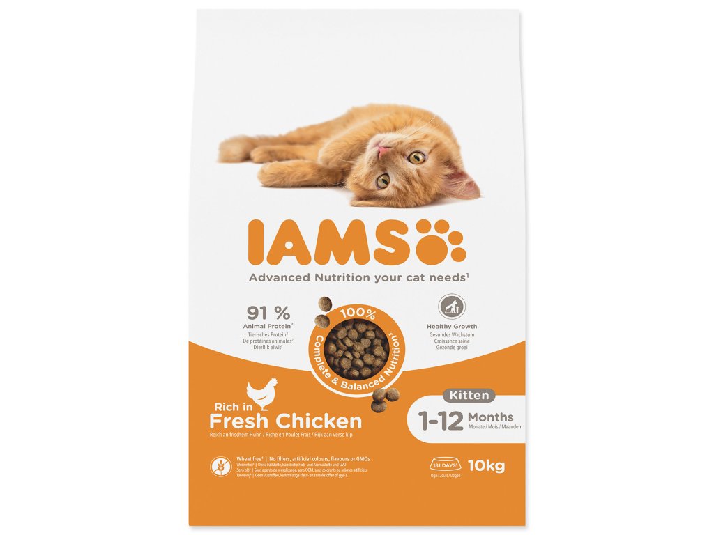 Krmivo IAMS for Vitality pro koťata je 100% kompletní a vyvážené, odborníky sestavené krmivo, které bude zvířeti chutnat a svědčit. Naše nová a vylepšená receptura pro koťata s čerstvým kuřecím masem je založena na kvalitních živočišných bílkovinách pečlivě vybraných tak, aby podporovaly sedm znaků zdravé vitality koťat. Aby byla koťata zdravá, aktivní a plná energie, obsahují naše lahodné receptury až 91 % živočišných bílkovin (z celkového obsahu bílkovin).