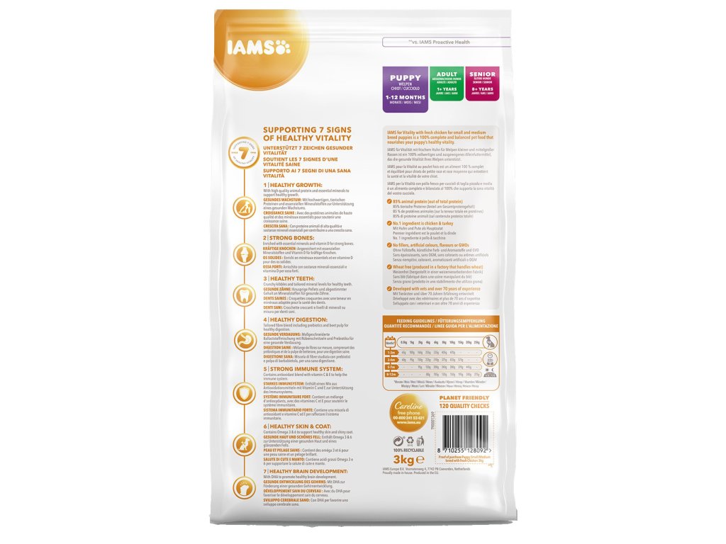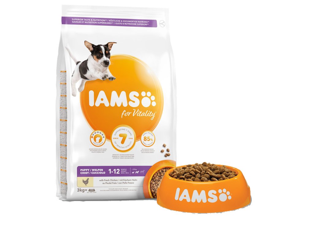 Krmivo IAMS for Vitality pro štěňata malých a středních plemen je 100% kompletní a vyvážené odborníky sestavené krmivo, které bude vašemu štěněti svědčit. Naše nová a vylepšená receptura pro štěňata s čerstvým kuřecím masem je založena na kvalitních živočišných bílkovinách, které byly pečlivě vybrány, aby podporovaly sedm znaků zdravé vitality štěněte. Aby byla štěňata zdravá, aktivní a plná energie, obsahují naše lahodné receptury až 85 % živočišných bílkovin z kuřecího masa (z celkového obsahu bílkovin).