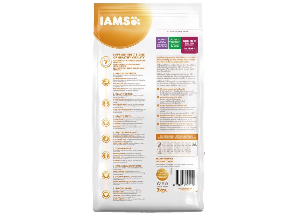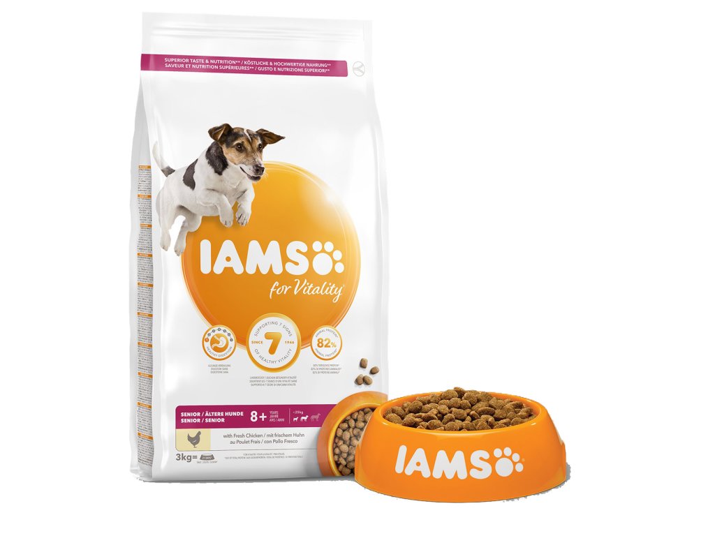 Krmivo IAMS for Vitality pro psí seniory malých a středních plemen je 100% kompletní a vyvážené, odborníky sestavené krmivo, které bude vašemu zvířeti chutnat a svědčit. Naše nová a vylepšená receptura pro psí seniory s čerstvým kuřecím masem je založena na pečlivě vybraných, kvalitních živočišných bílkovinách, které podporují sedm znaků zdravé vitality psa. Aby byl váš pes zdravý, aktivní a plný energie, obsahují naše lahodné receptury až 82 % živočišných bílkovin (z celkového obsahu bílkovin).
