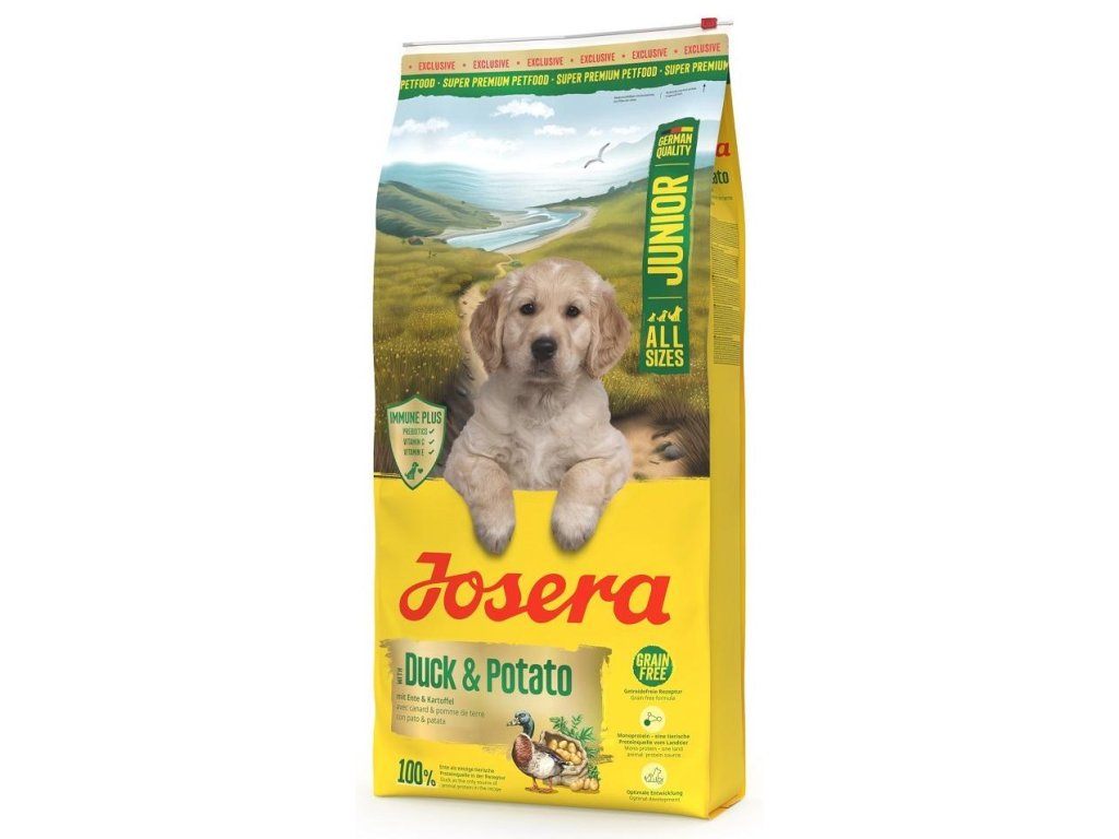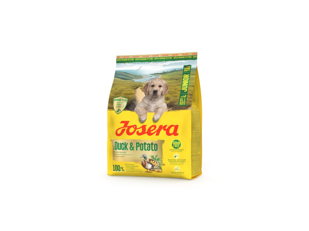 Náš absolutní favorit v misce je k dispozici i pro štěňata: Josera Junior Duck & Potato je krmivo pro odchov štěňat se 100% kachnou a lahodnými bramborami. Střední obsah energie a vyvážený poměr vápníku a fosforu podporují vývoj kostí vašeho malého čtyřnohého přítele a tím i optimální růst. Bezobilninová receptura vychází z receptury naší klasické Ente & Kartoffel, a proto ji lze krmit až do dospělosti a poté snadno přejít na jiné krmivo.